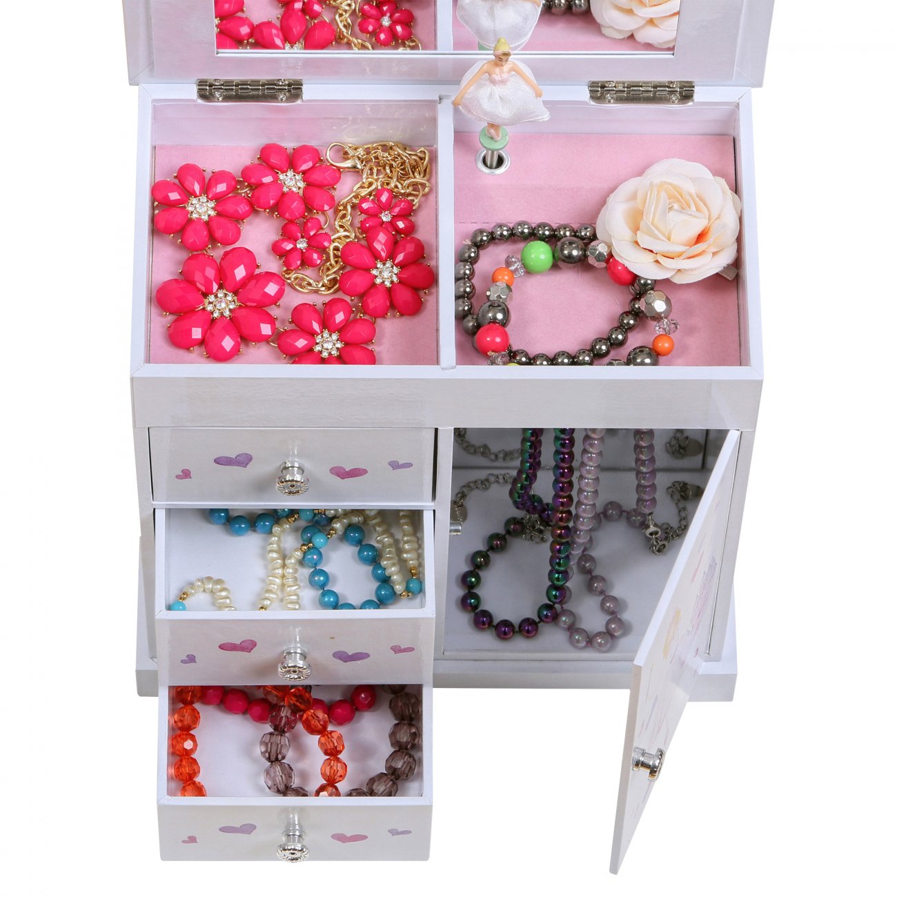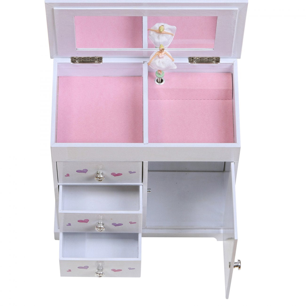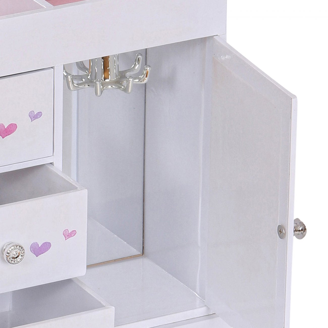 Ce coffret allie beauté et praticité : un miroir intérieur complet, un carrousel à colliers avec fermeture magnétique, deux sections ouvertes doublées de tissu suédé rose, et trois tiroirs spacieux pour organiser bijoux et petits souvenirs. Chaque détail, des poignées argentées à la finition soignée, reflète le savoir-faire délicat de Mele & Co.