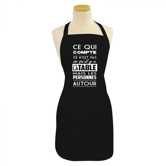 Offrez-vous (ou offrez à quelqu’un que vous aimez) ce tablier unisexe fabriqué au Québec, arborant la phrase inspirante : « Ce qui compte, ce n’est pas ce qu’il y a sur la table, mais les personnes autour. »