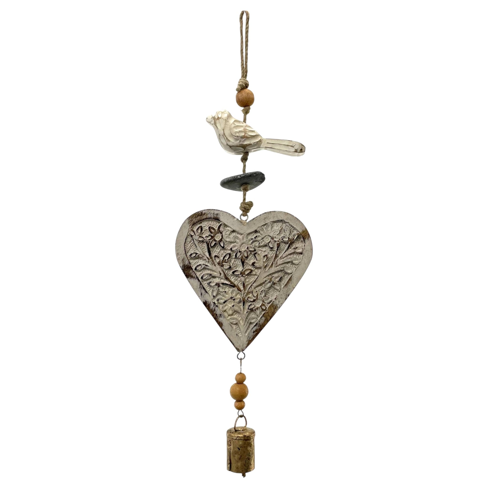 Carillon en bois de manguier, oiseau et coeur blanc vintage