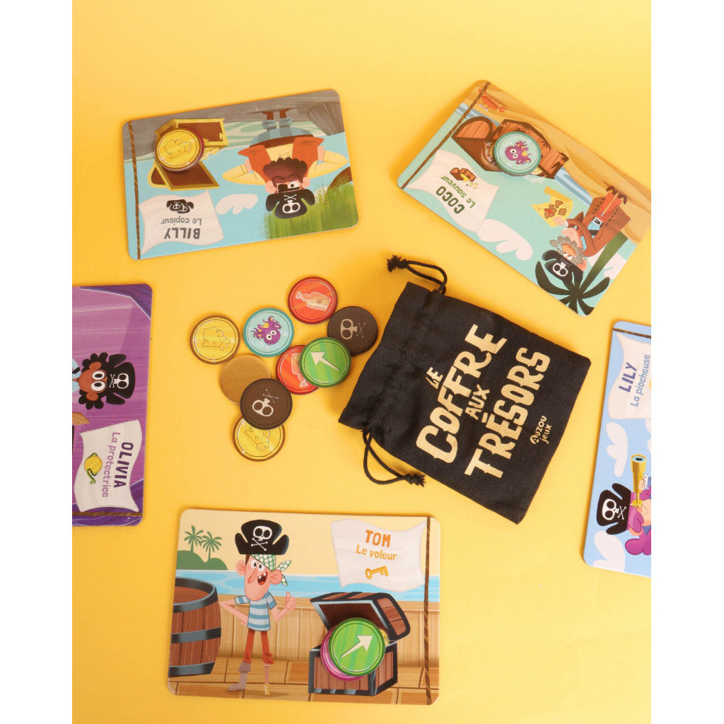 Gagne le plus de pièces pour remporter la partie ! Tu viens de trouver un super coffre rempli de trésors ! Collectionne un maximum de pièces pour gagner la partie, mais attention aux autres pirates qui désirent le même butin que toi ! Un jeu de chance et de tactique !